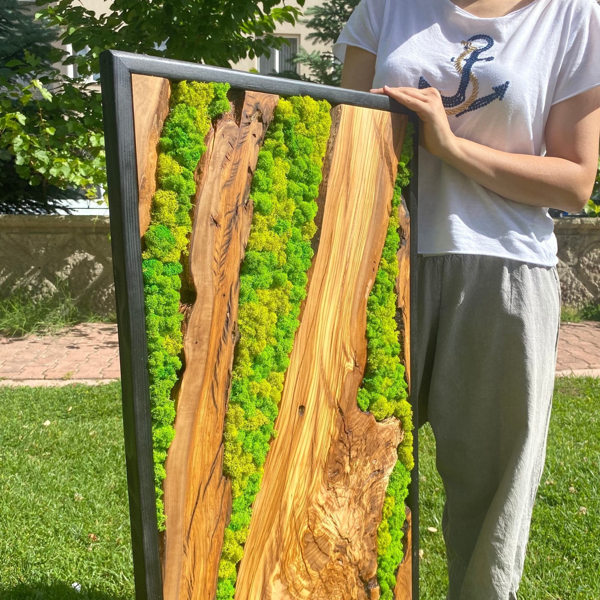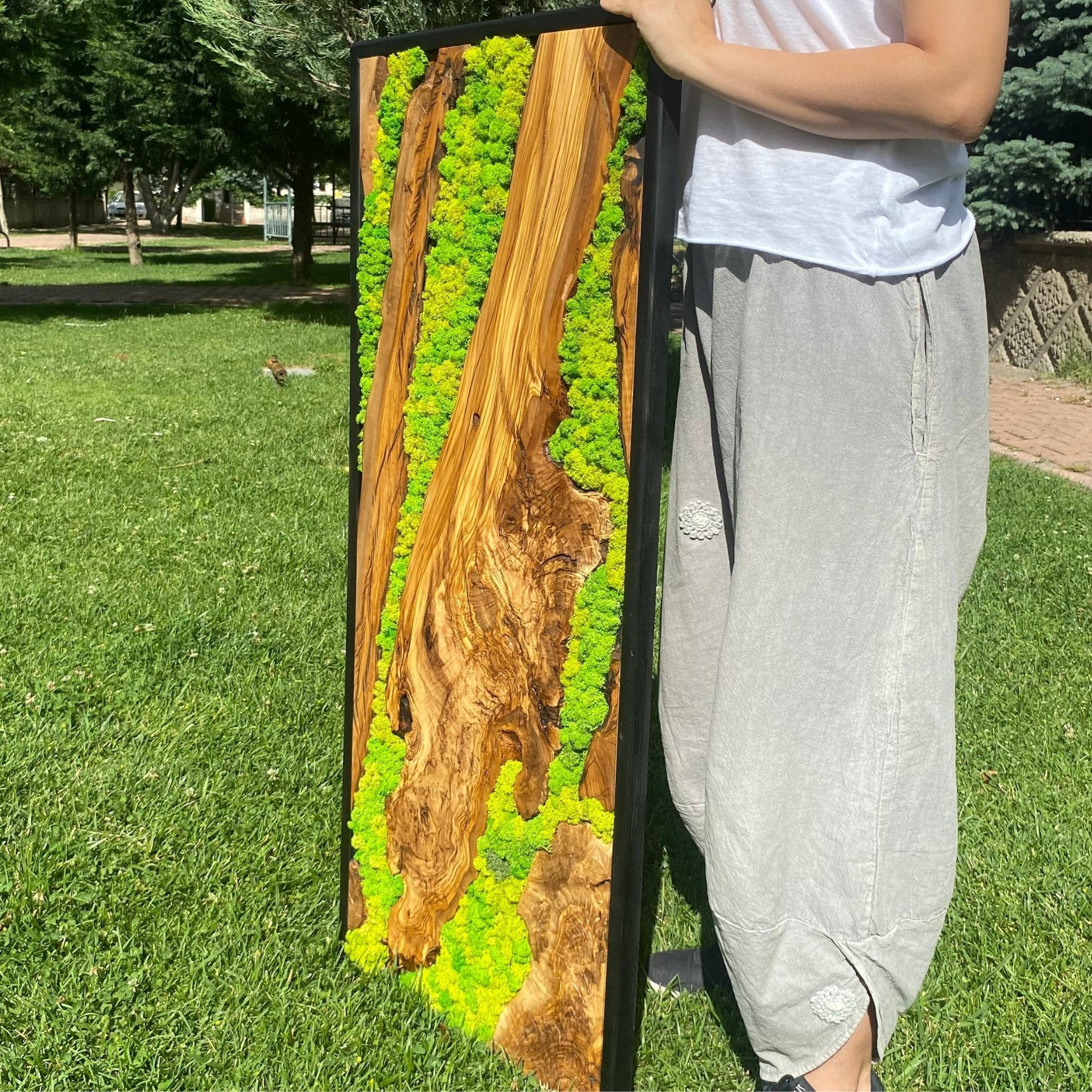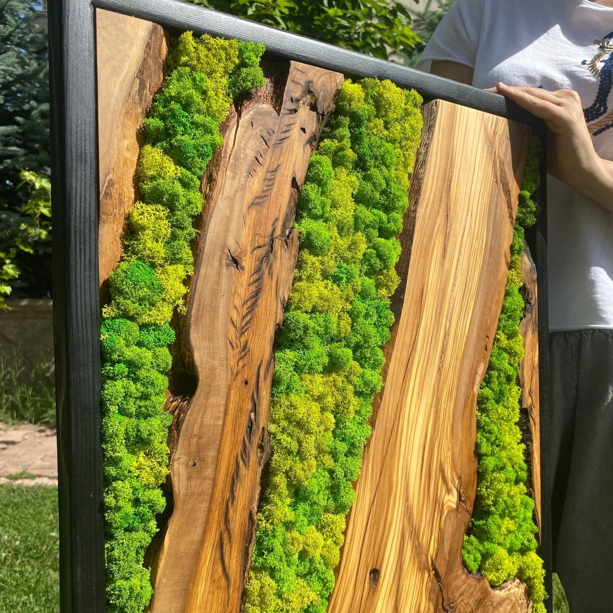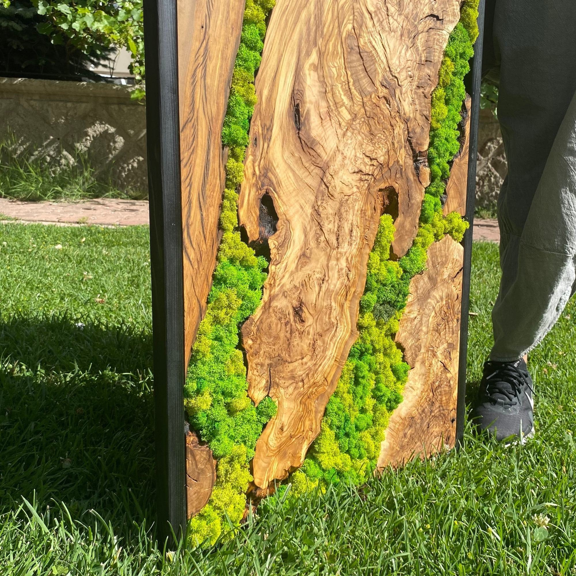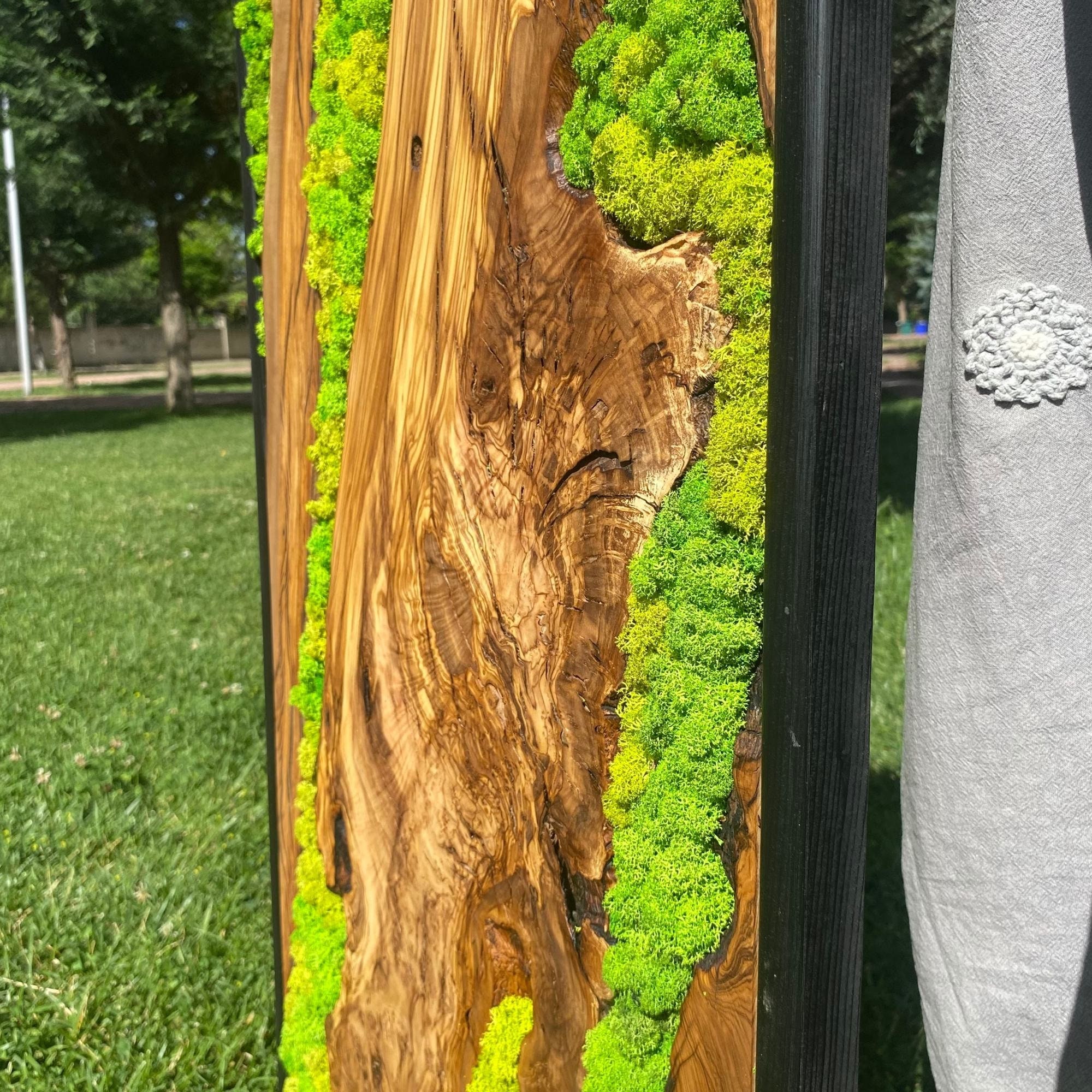 Bring the essence of nature into your home with our Handcrafted Moss Wall Art with live edge olive wood.