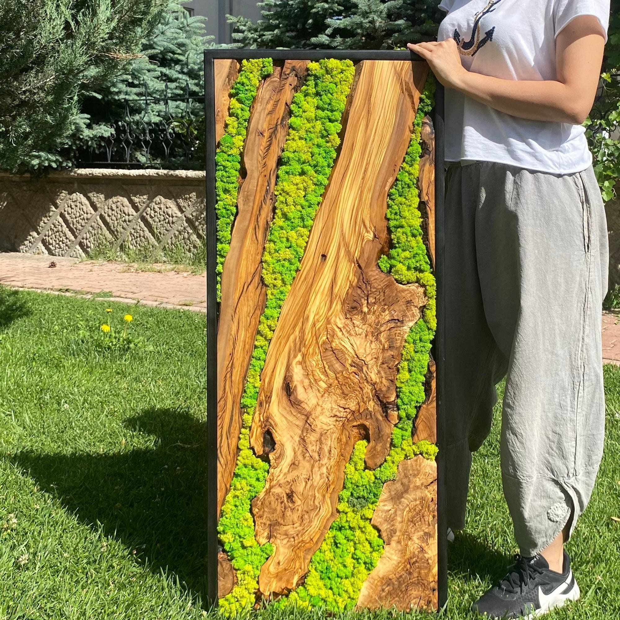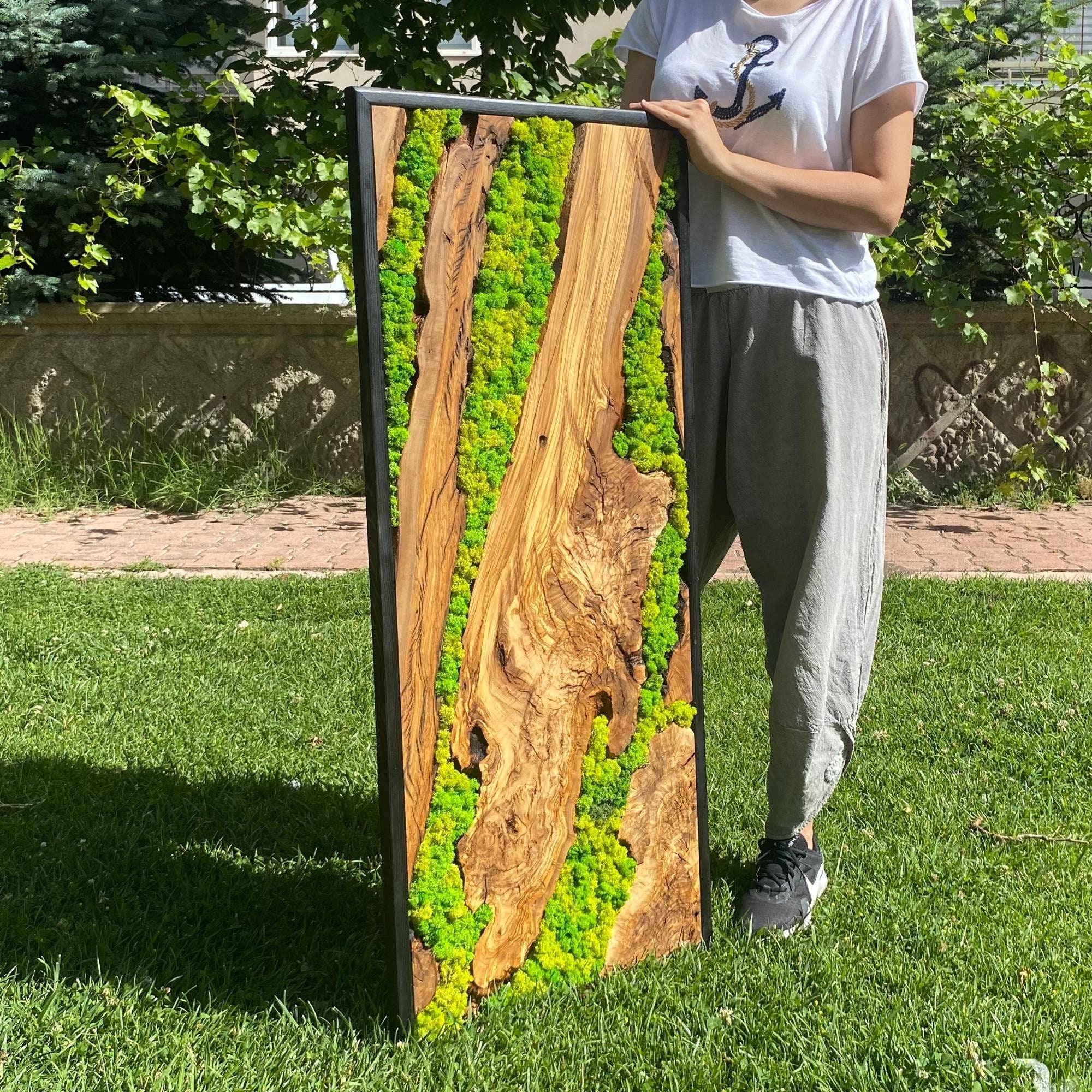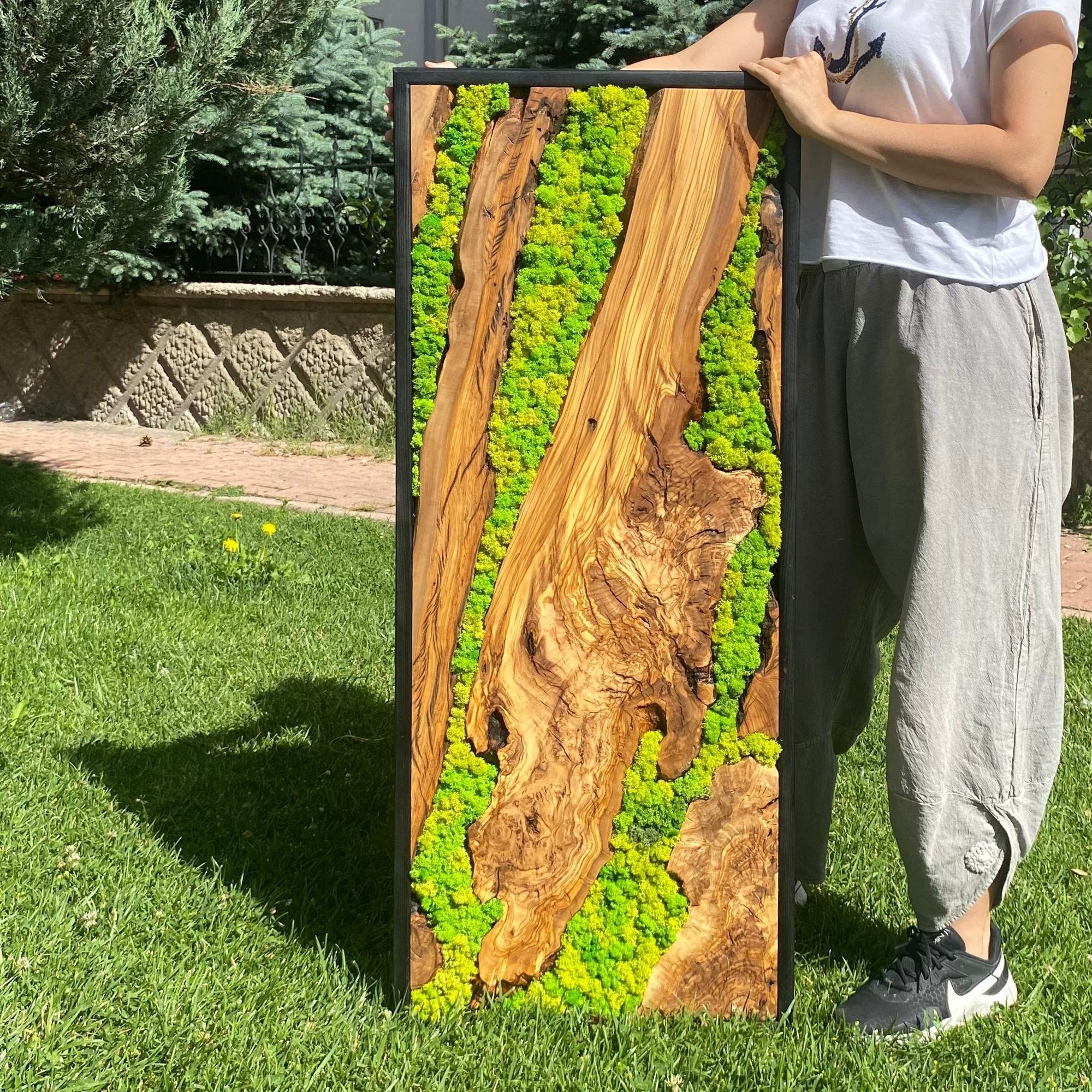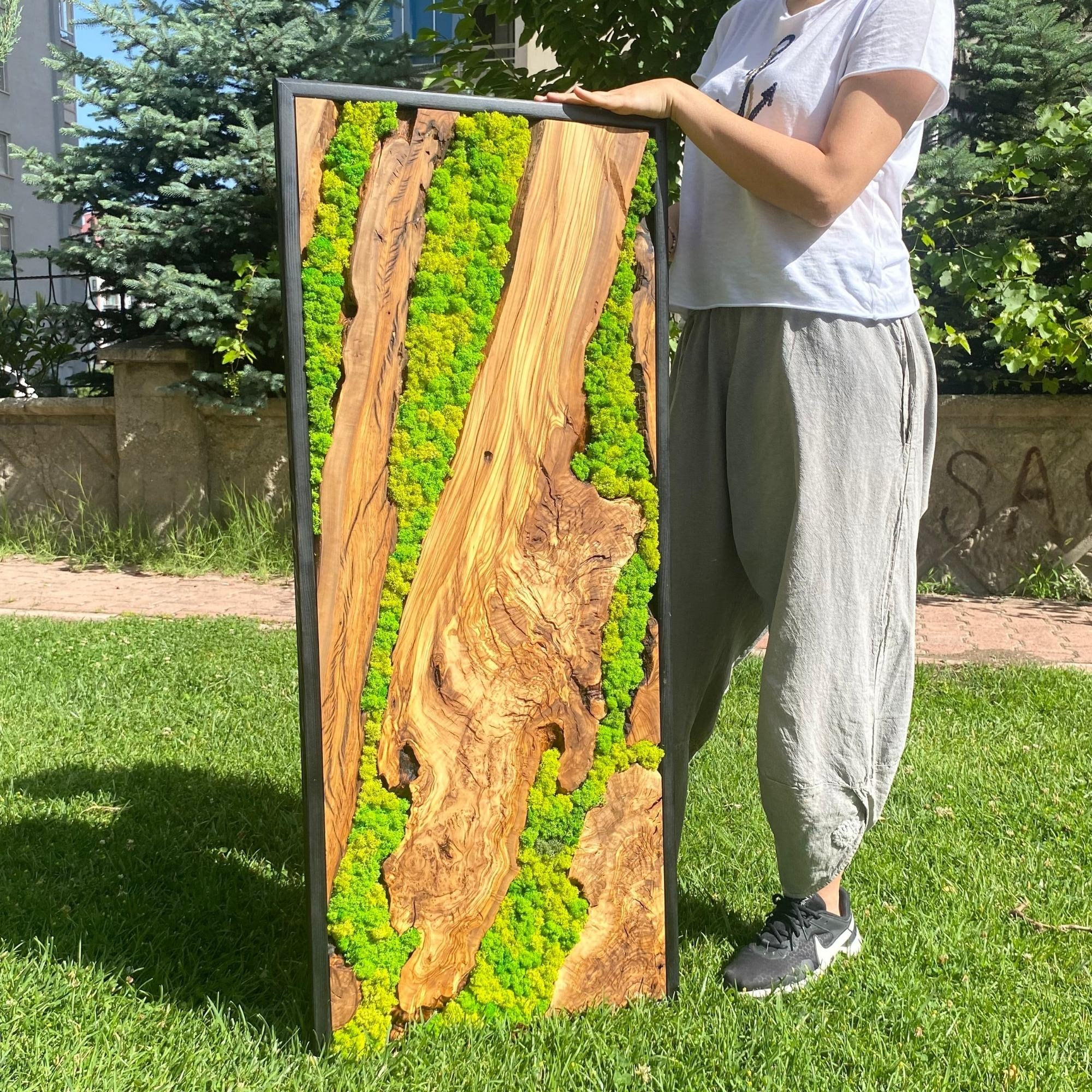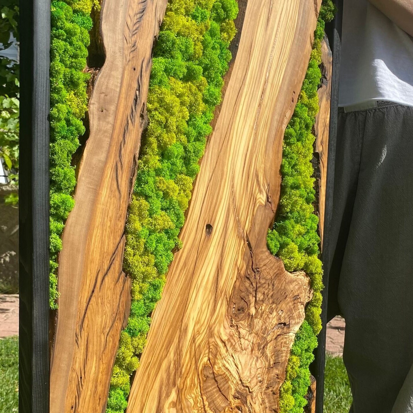Bring the essence of nature into your home with our Handcrafted Moss Wall Art with live edge olive wood.