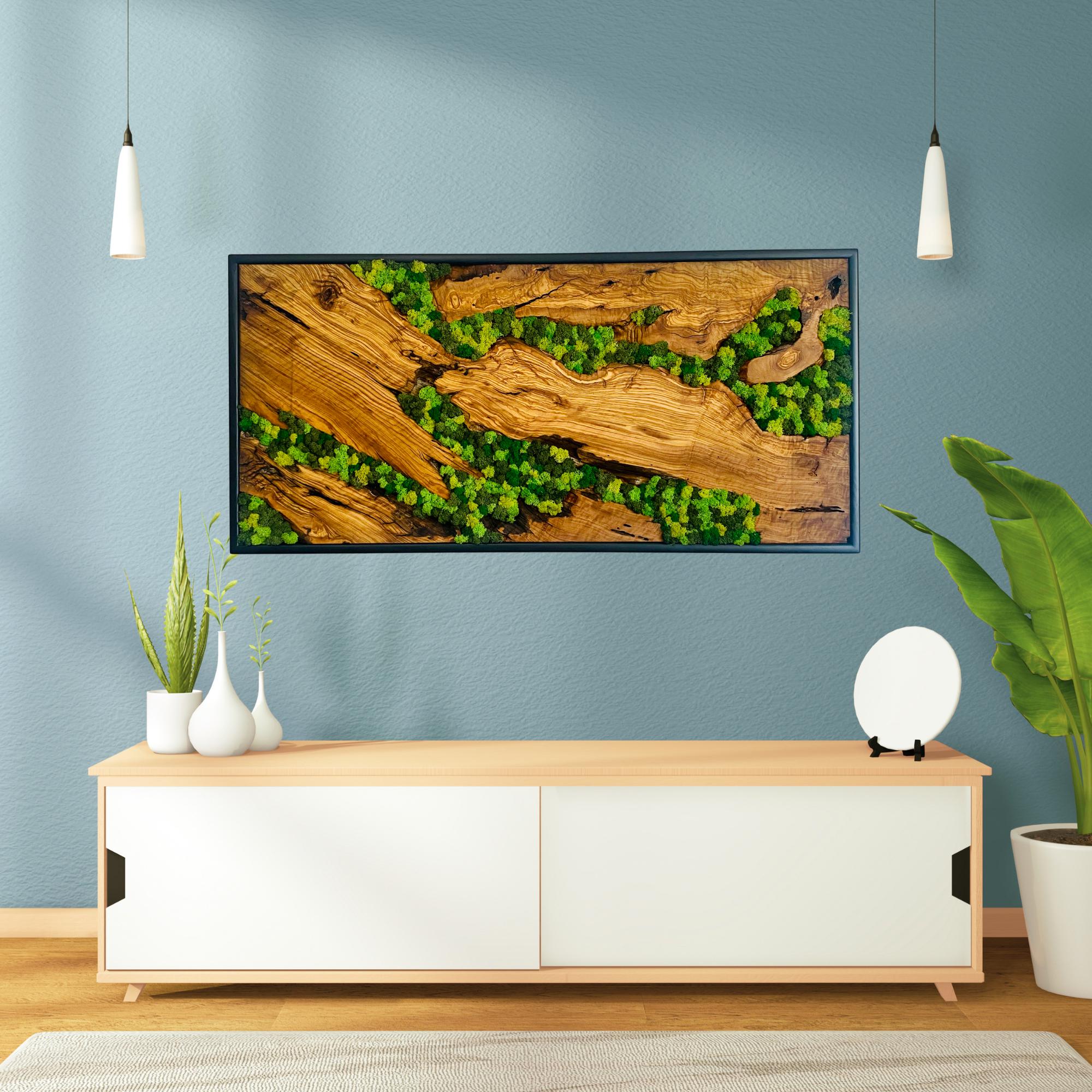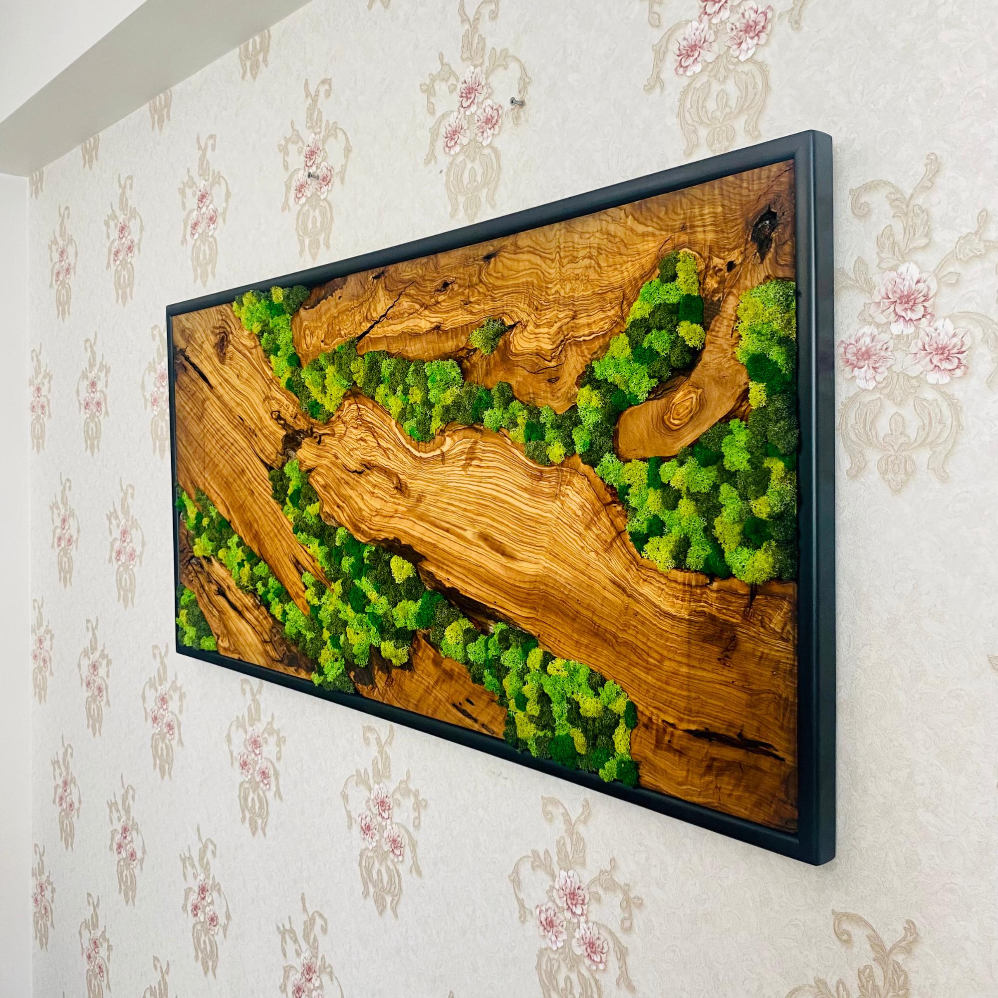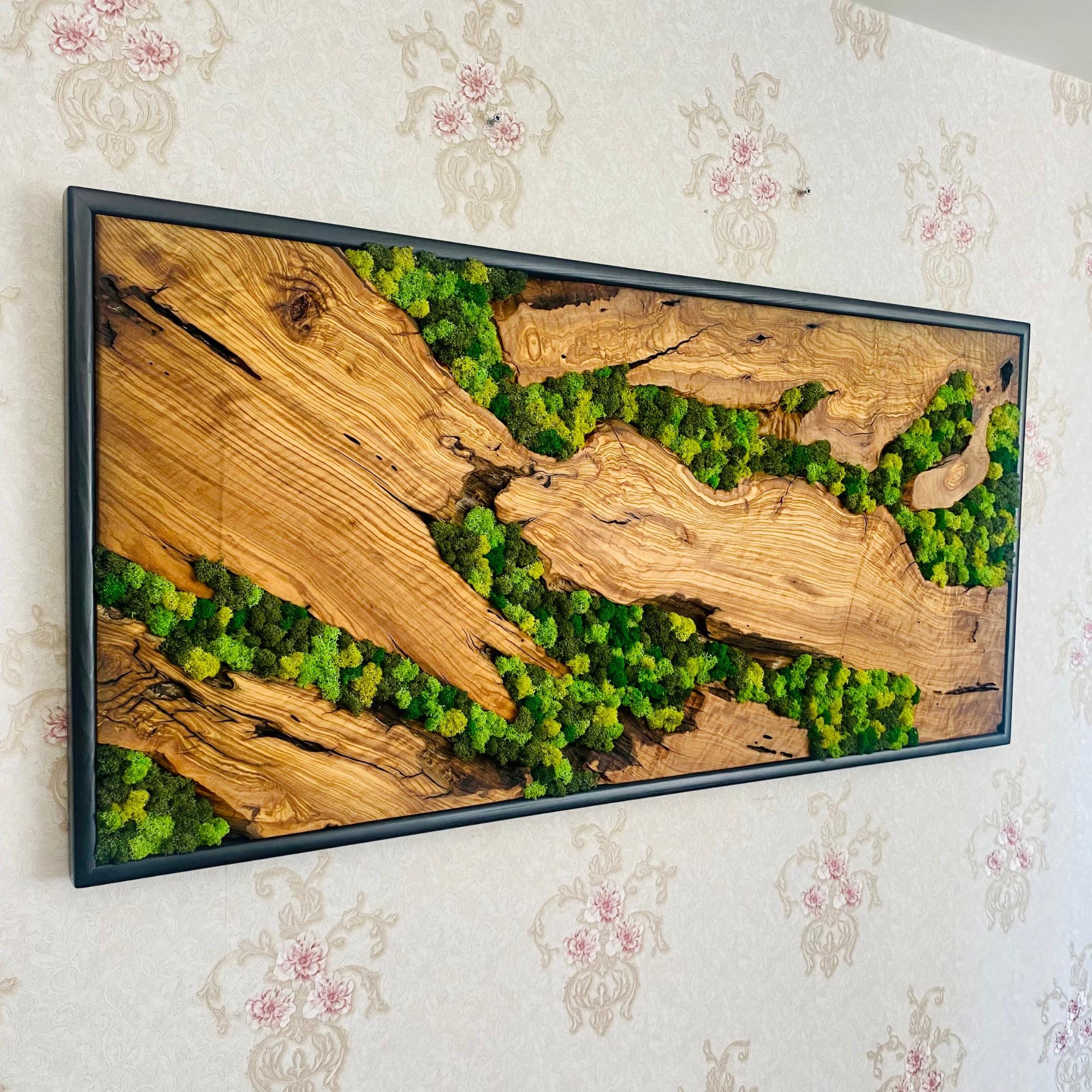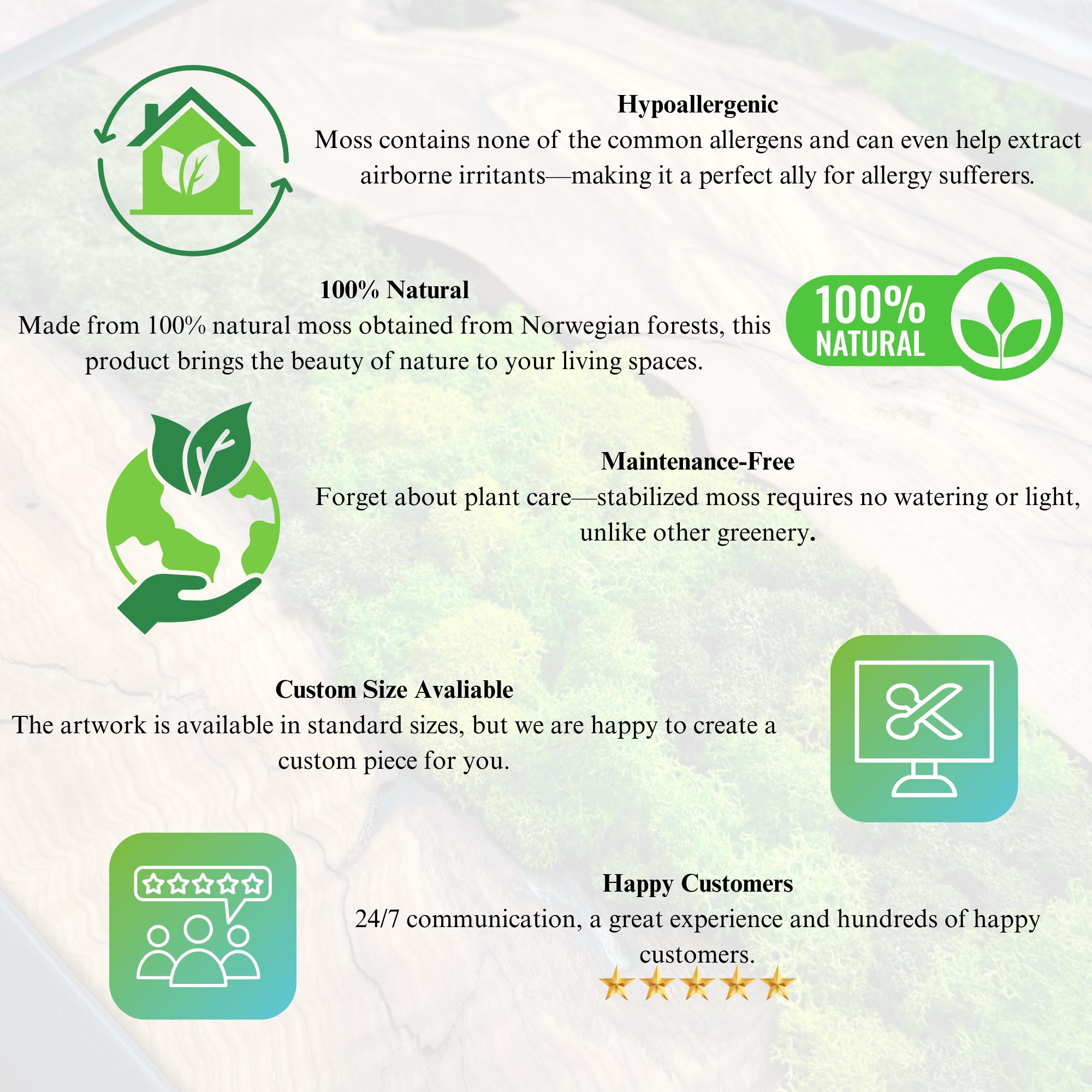 Preserved moss wall art needs no upkeep like watering, sunlight, or fertilizing. It stays the same size, just keep it away from sunlight, water and too much air.