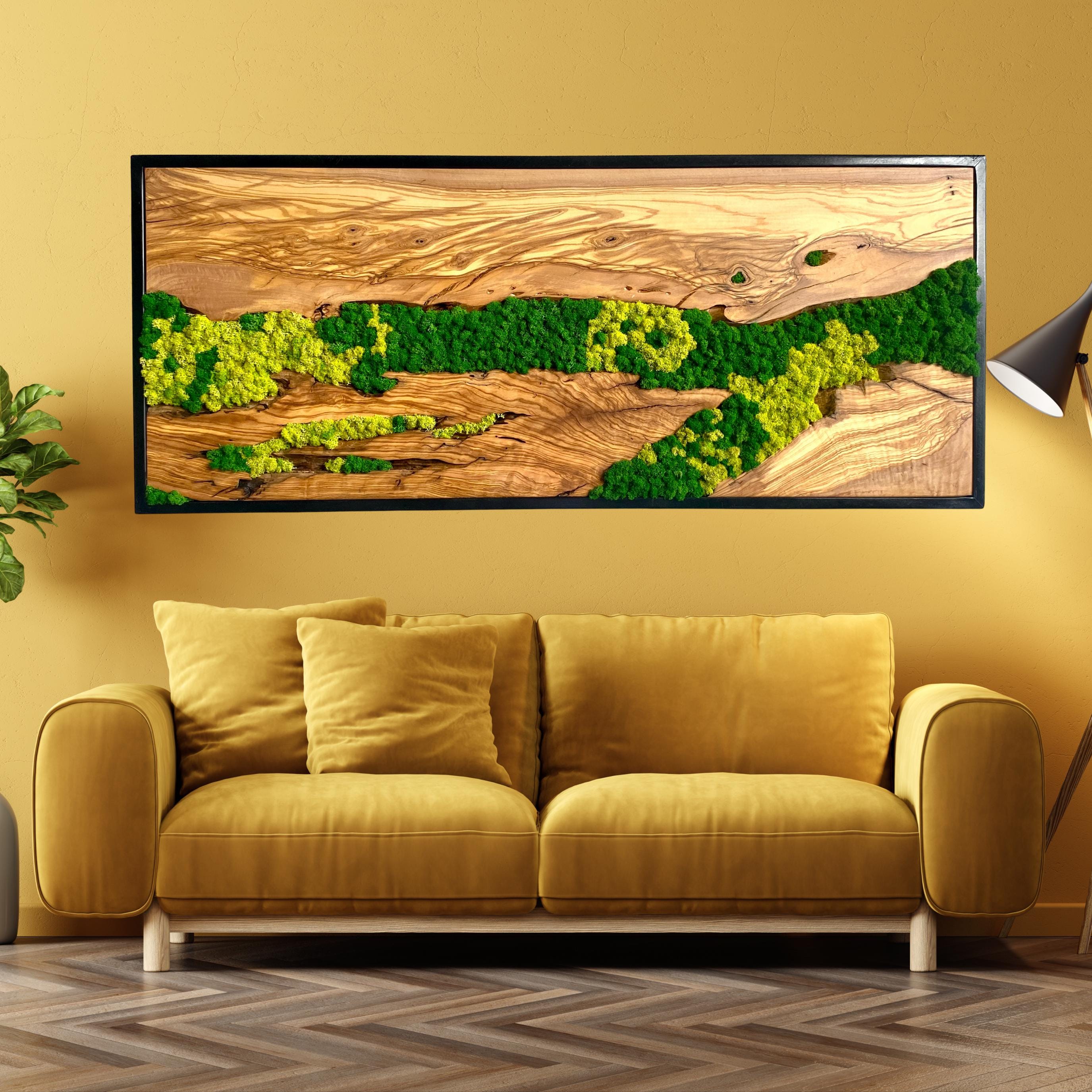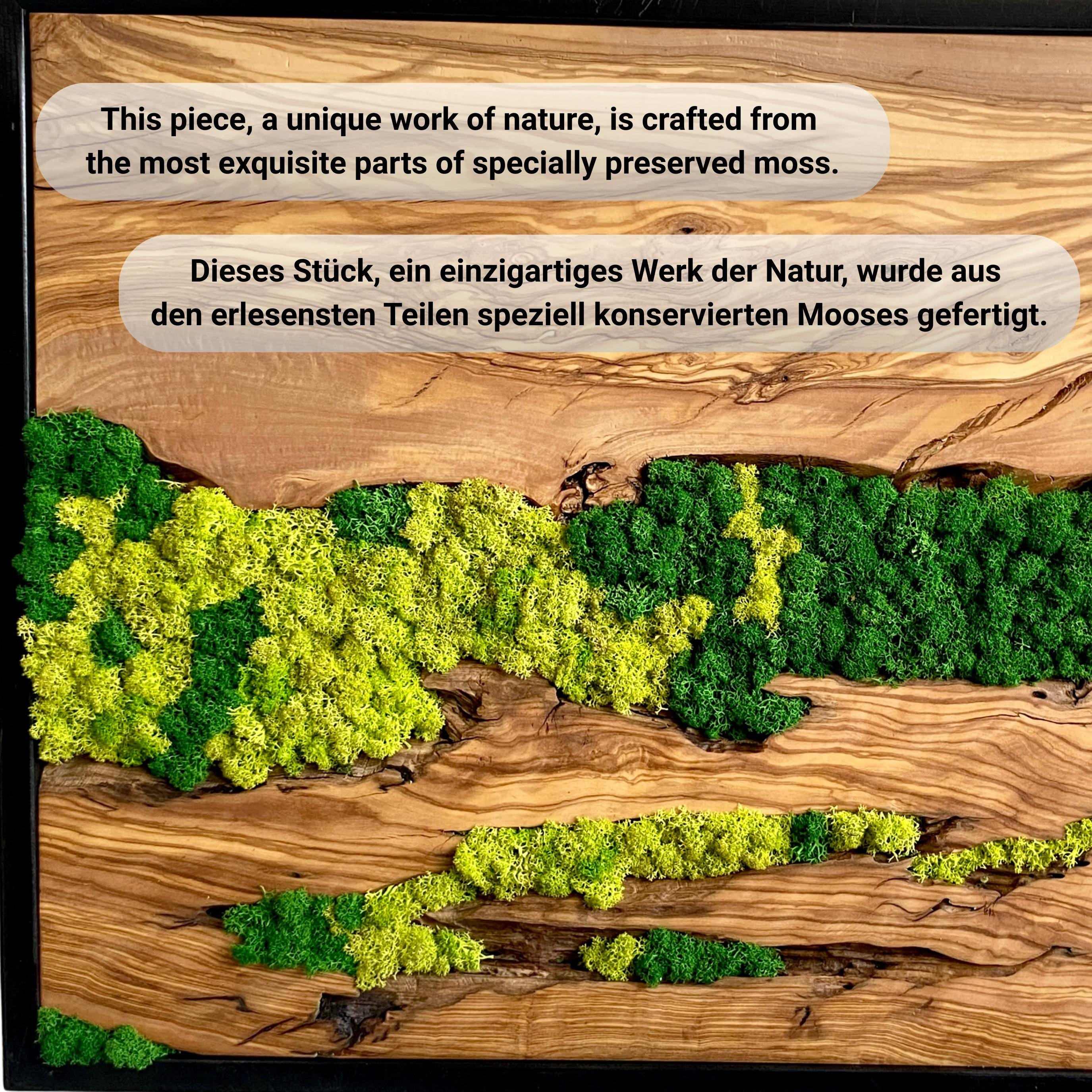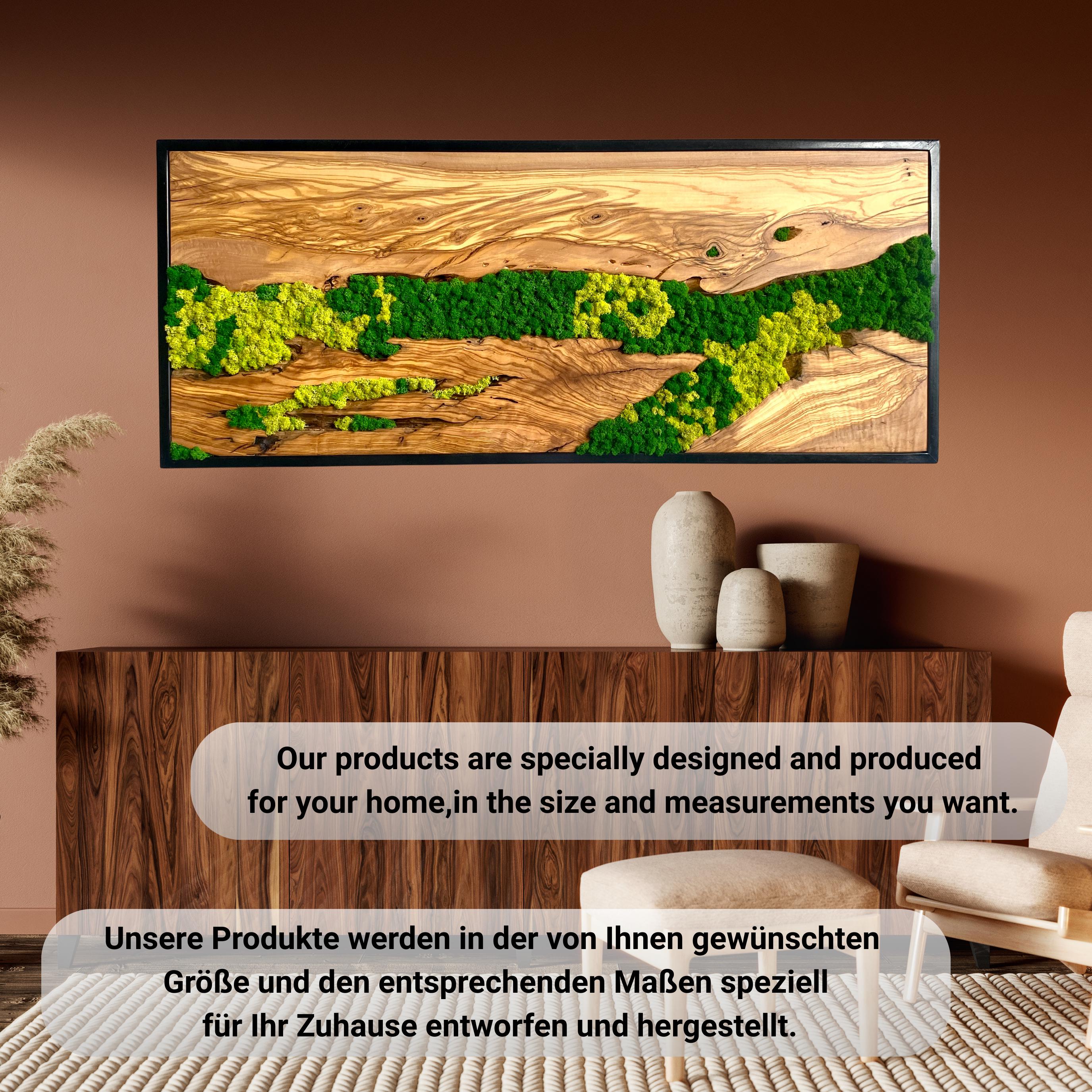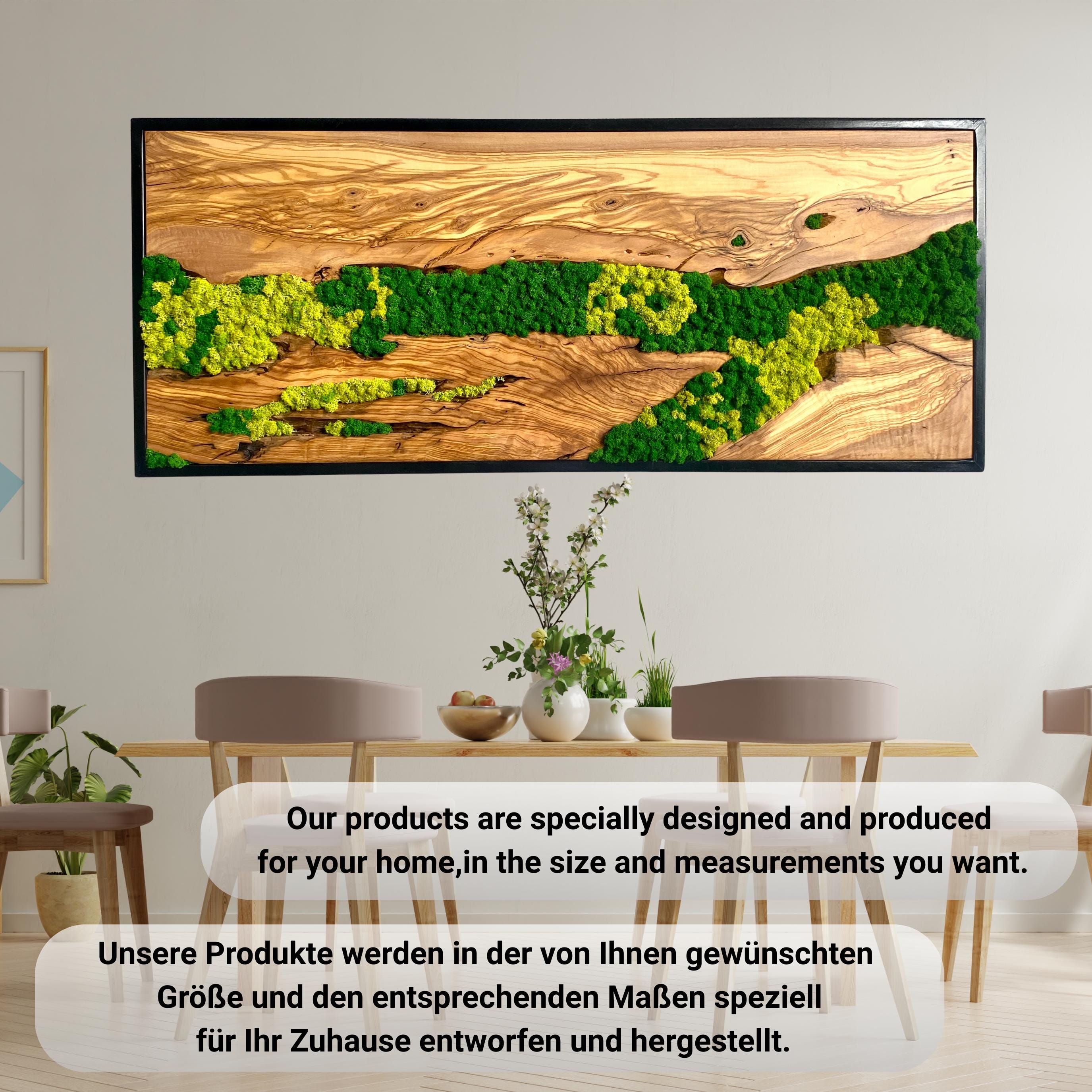 Bring the peace of nature into your modern living space with this handmade moss wall art. This eye-catching botanical wall art piece offers a perfect blend of the warmth and elegance of natural materials. This moss art panel also stands out as a unique piece of wooden wall decor and wood art.