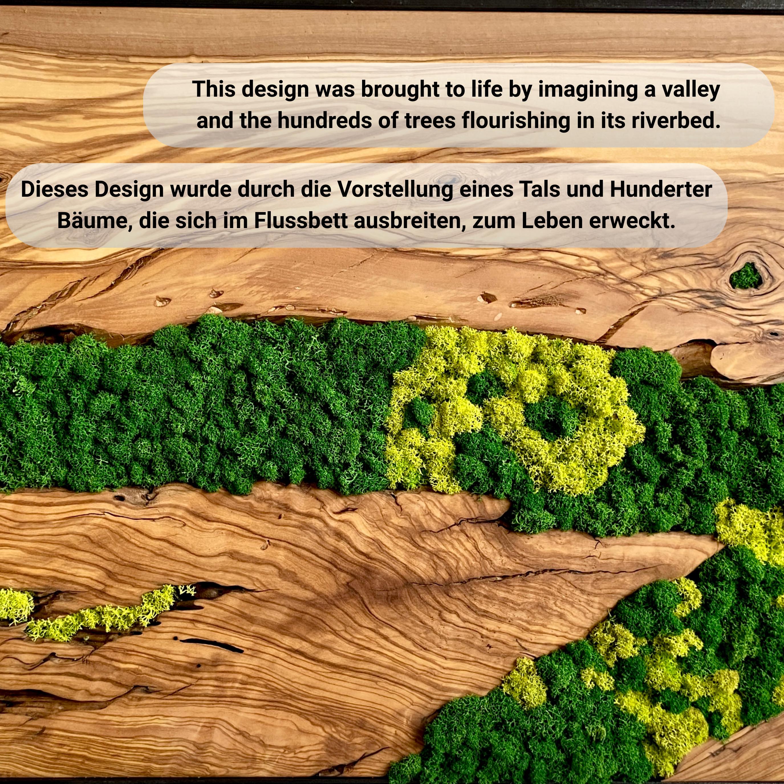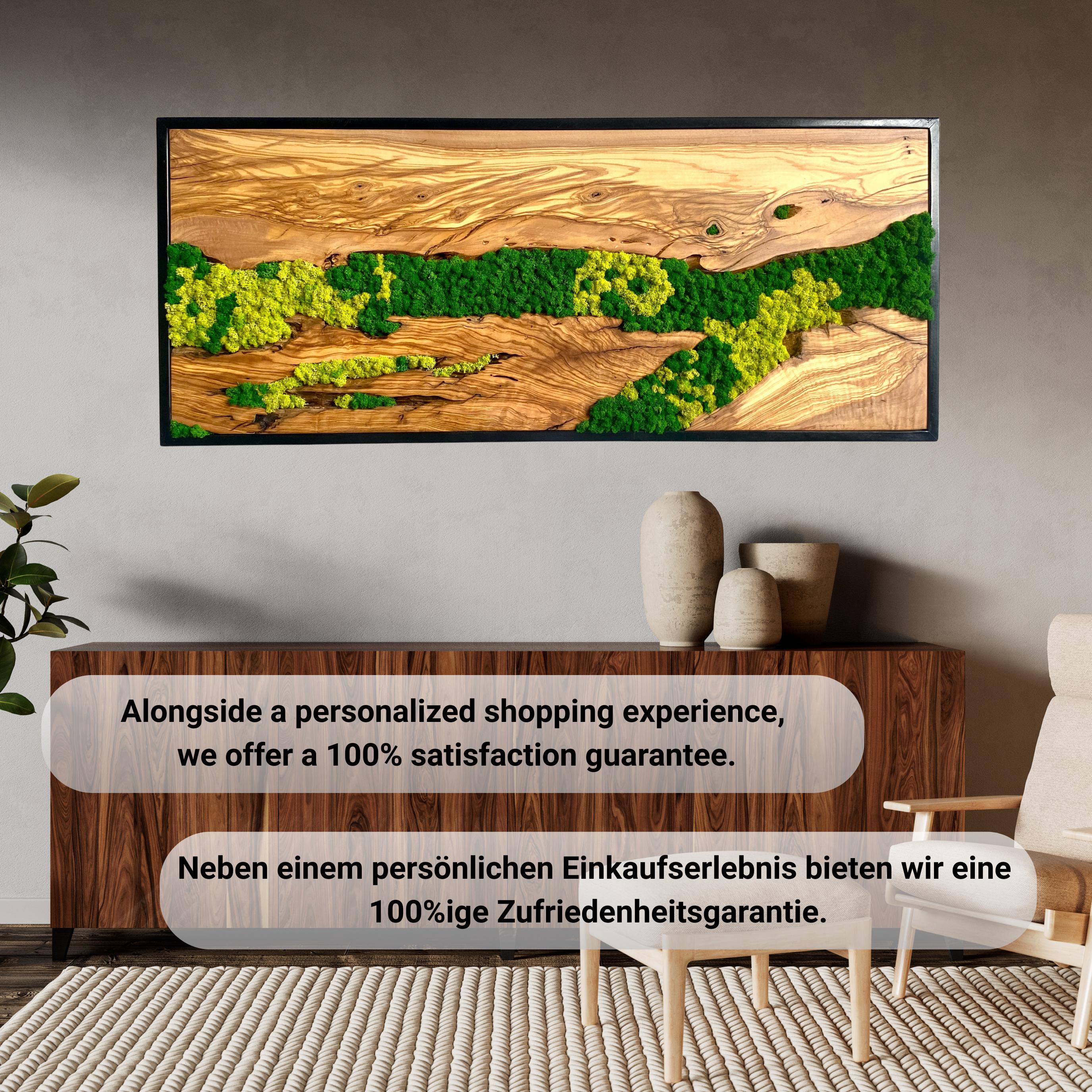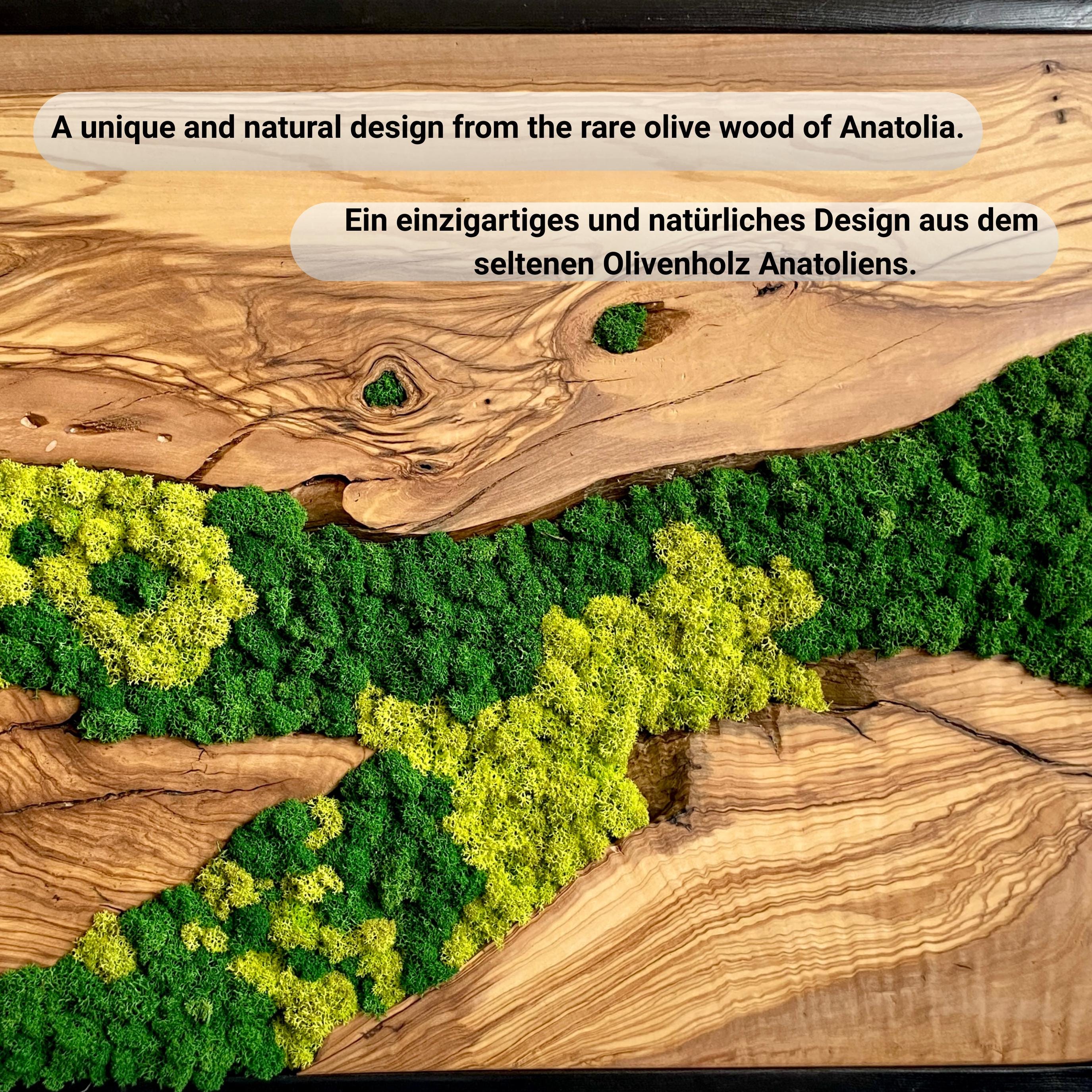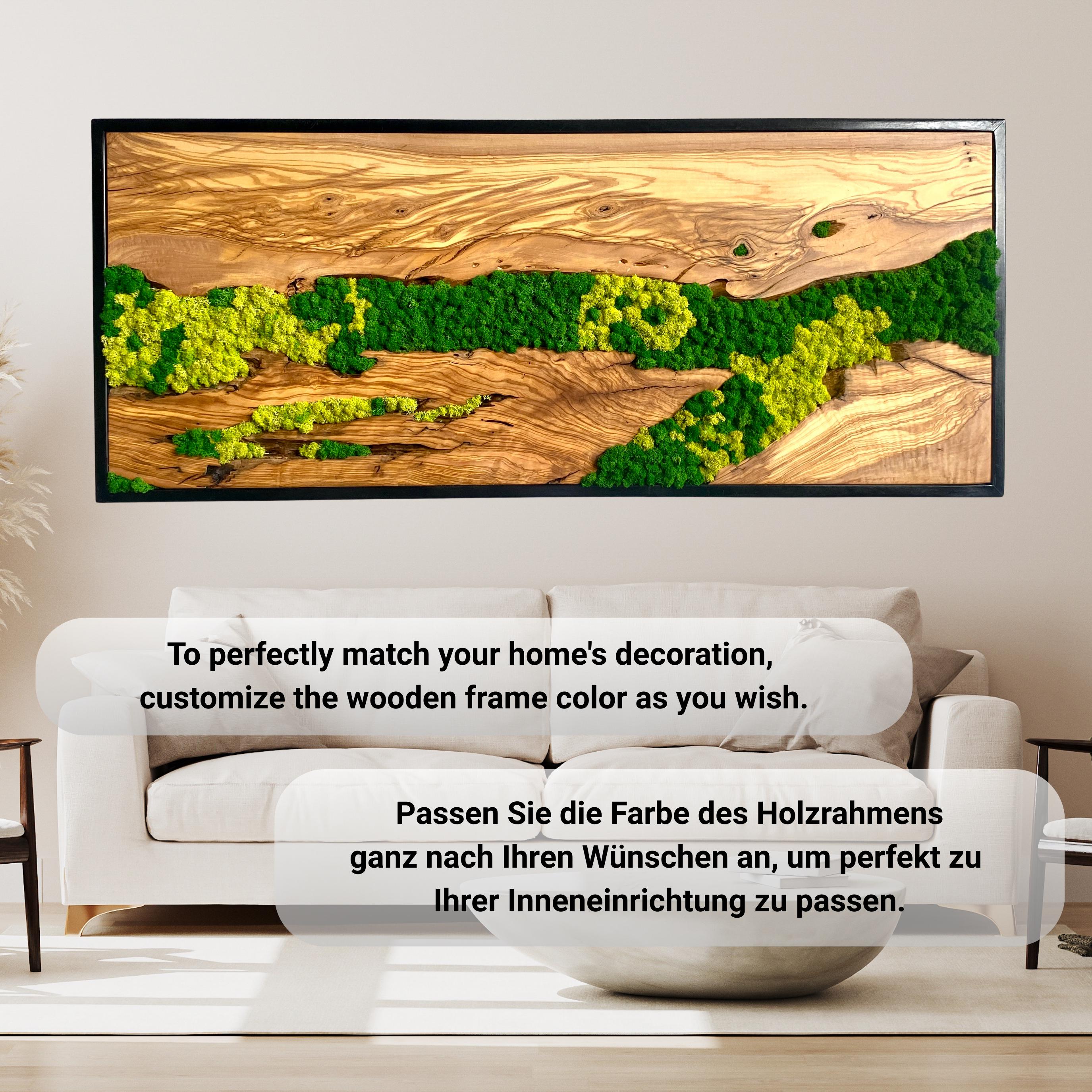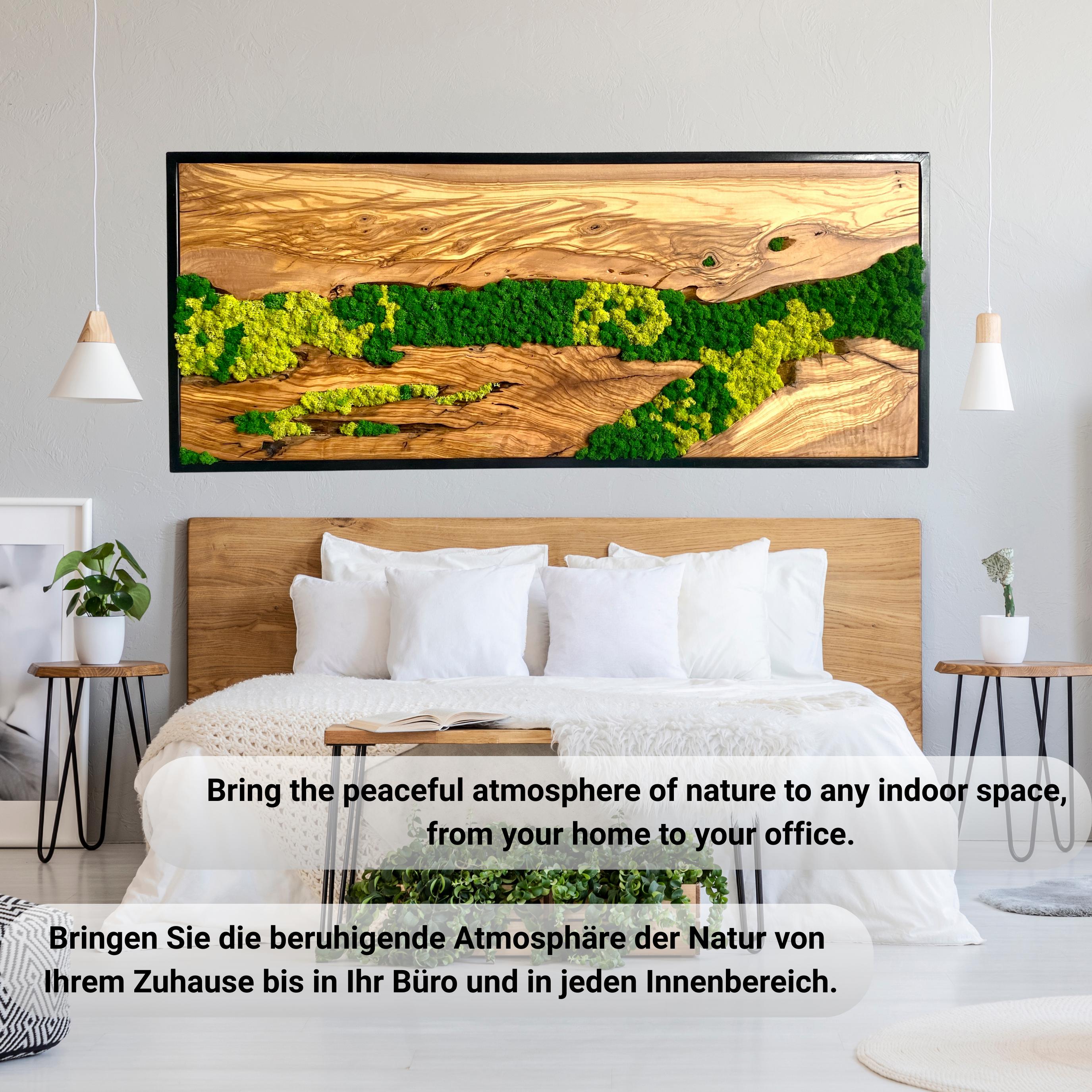 Bring the peace of nature into your modern living space with this handmade moss wall art. This eye-catching botanical wall art piece offers a perfect blend of the warmth and elegance of natural materials. This moss art panel also stands out as a unique piece of wooden wall decor and wood art.