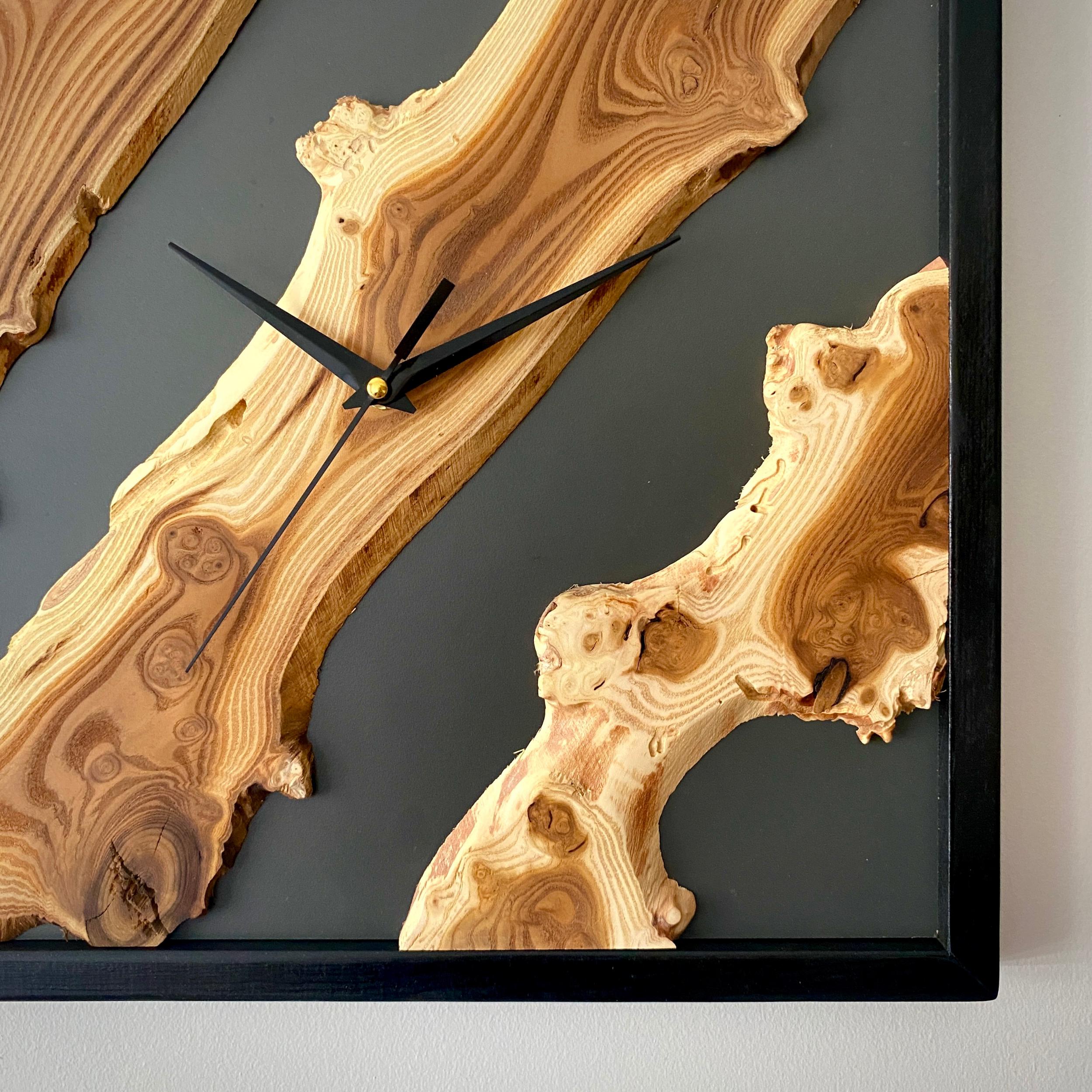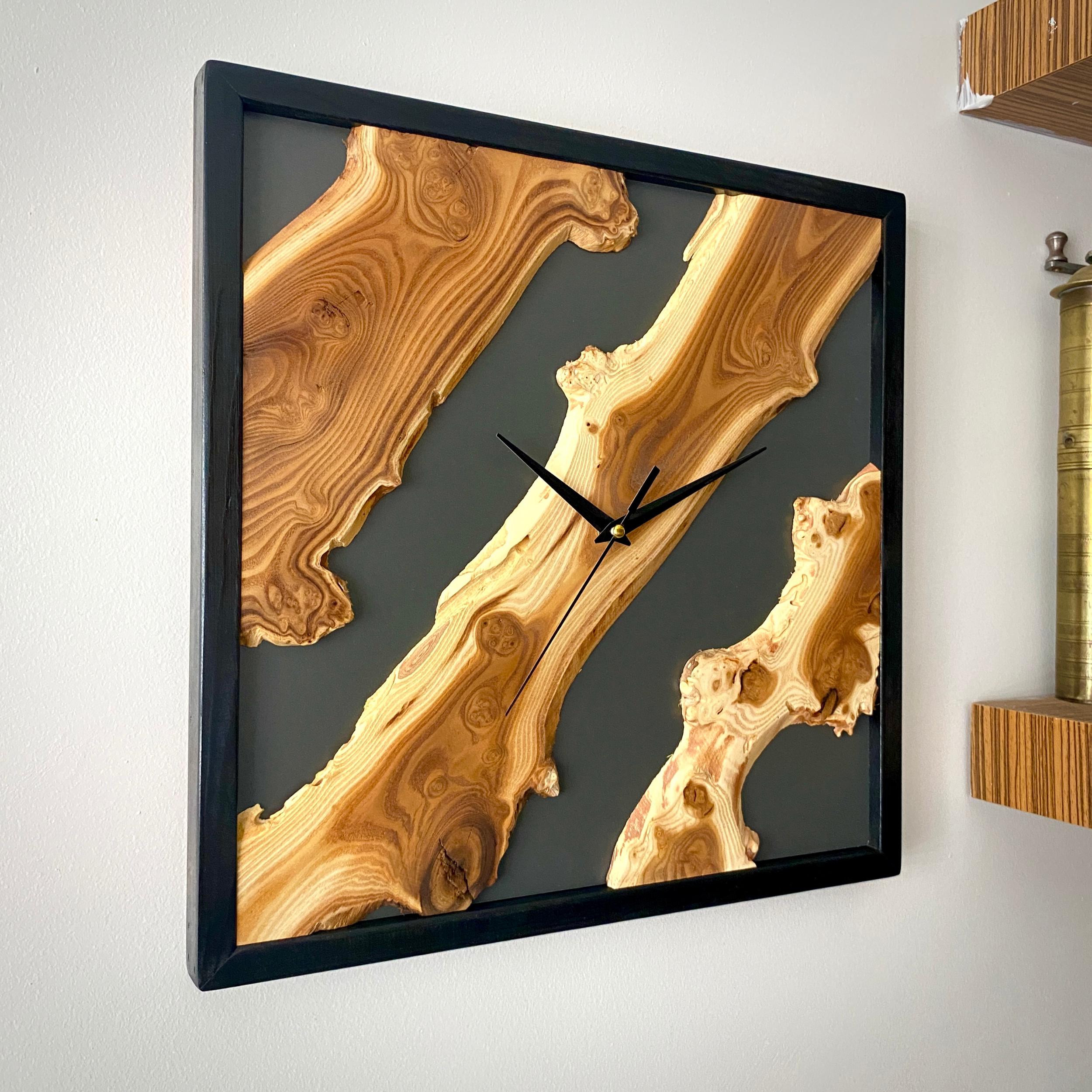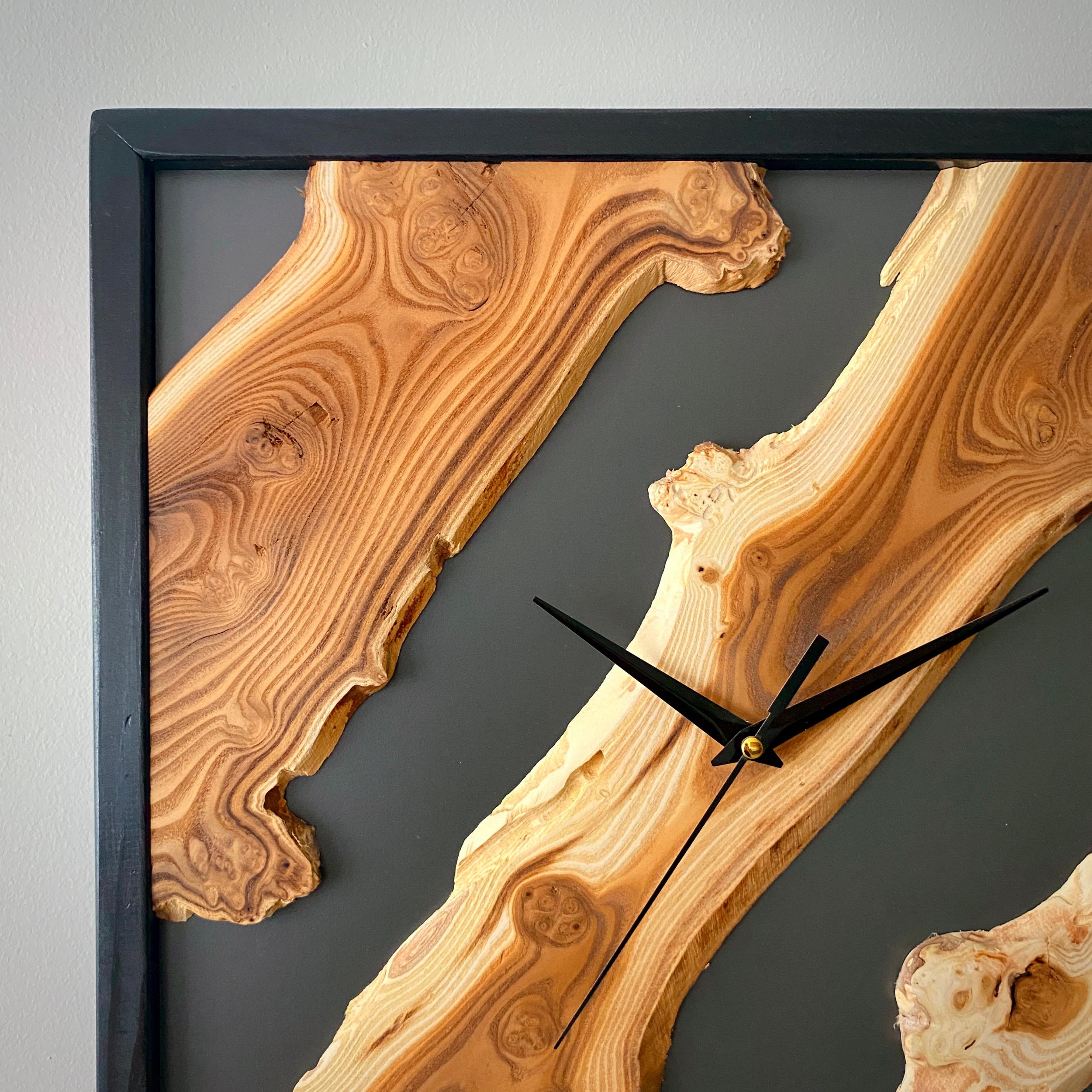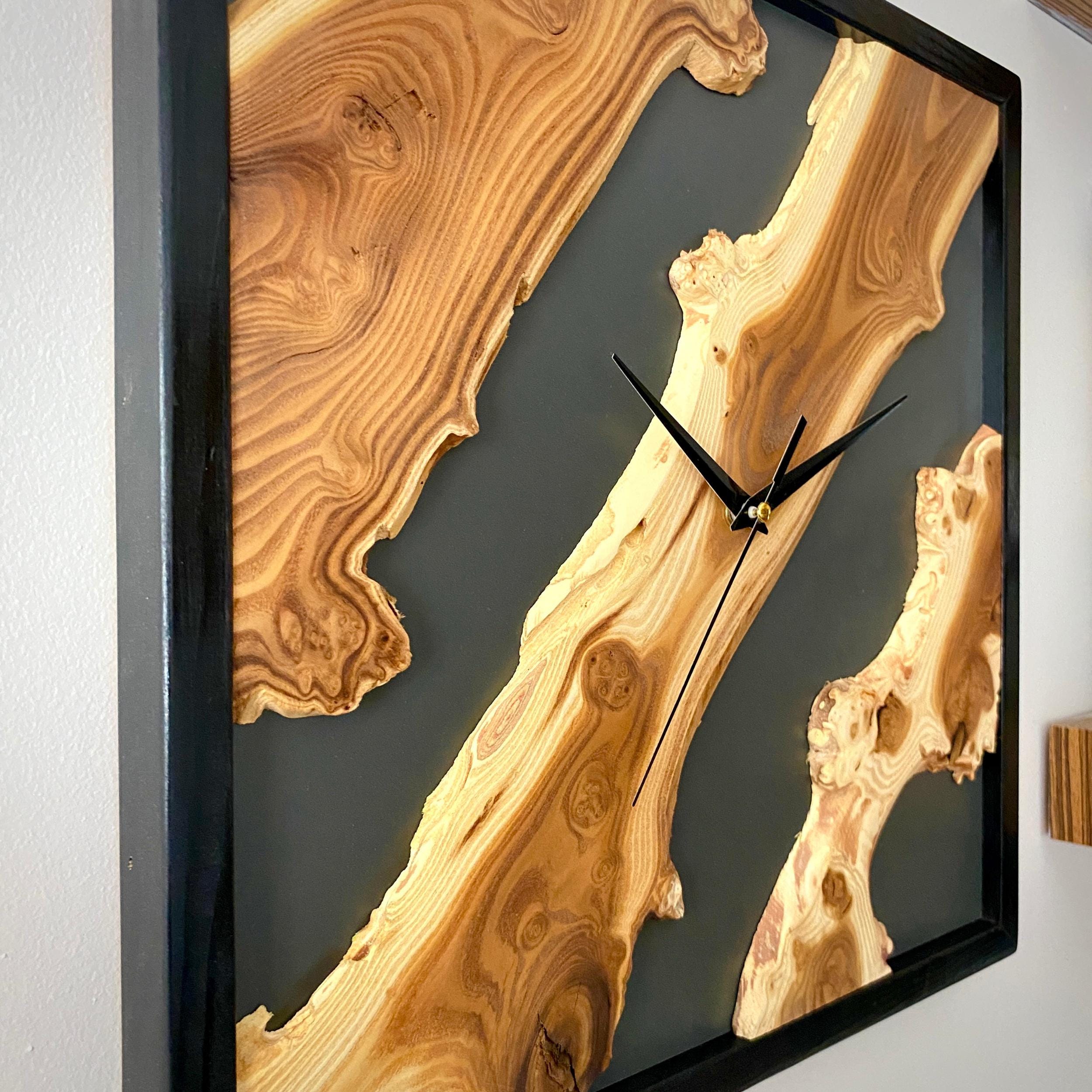 Live Edge Olive Wood Clock: Rustic Black Frame Wall Art
