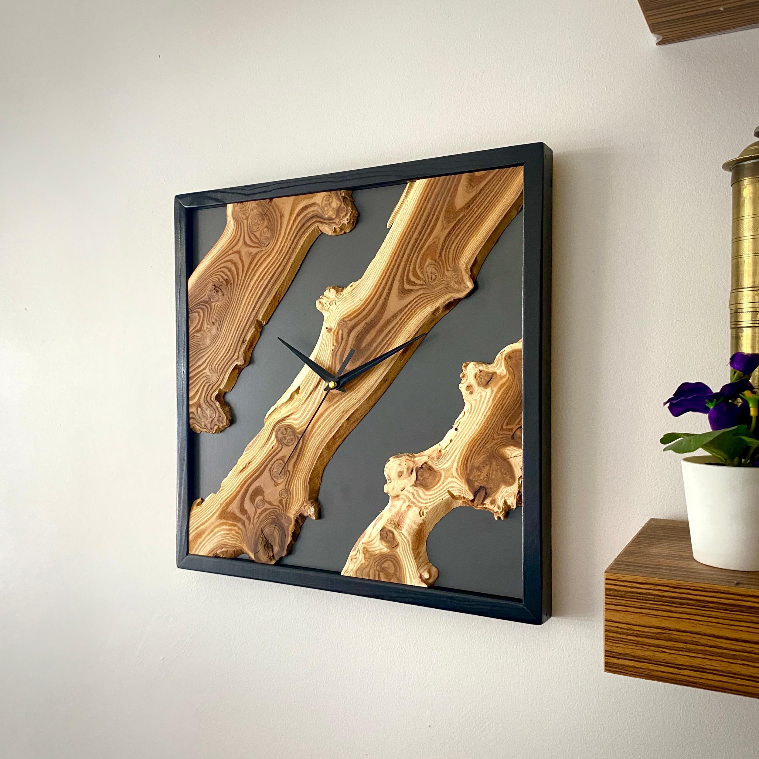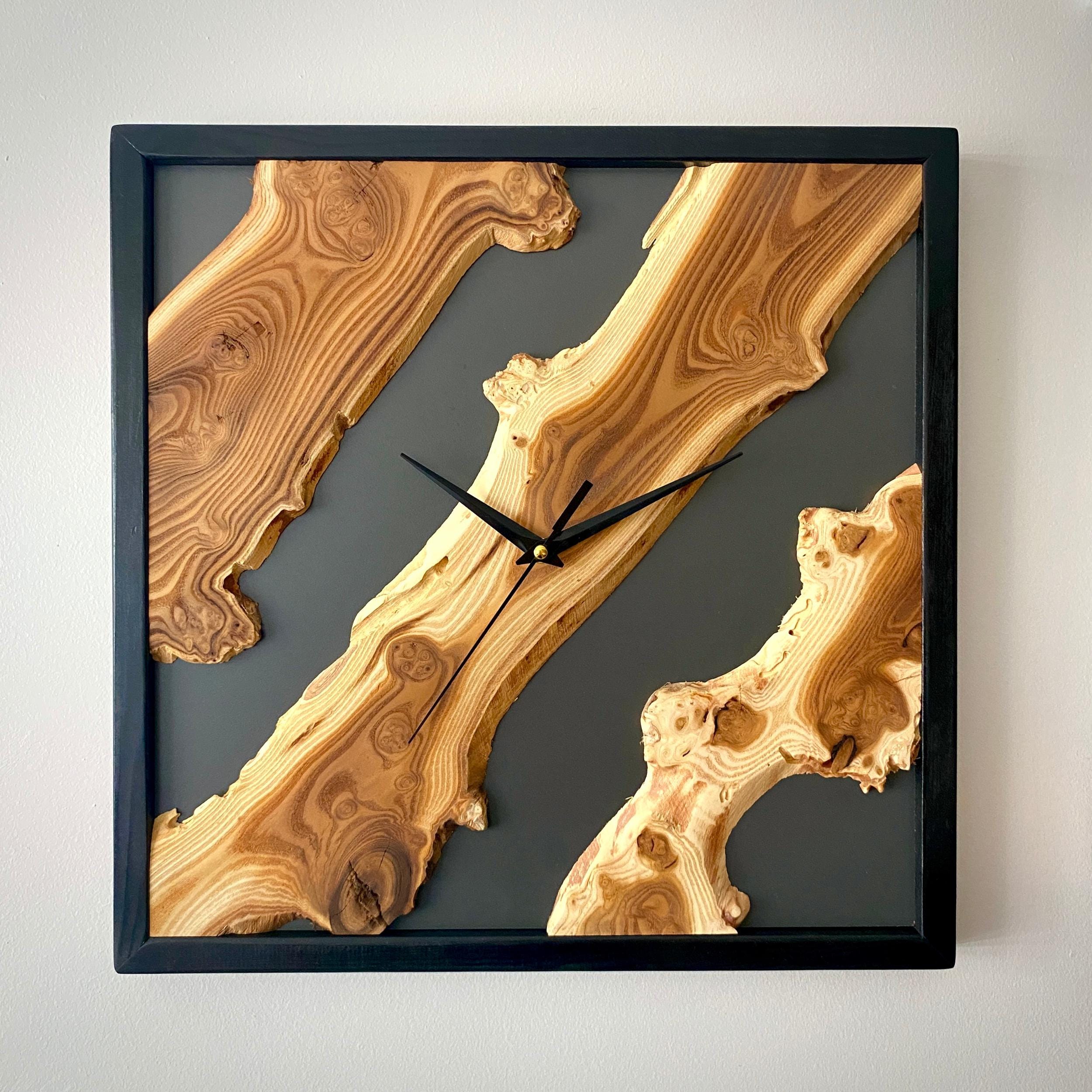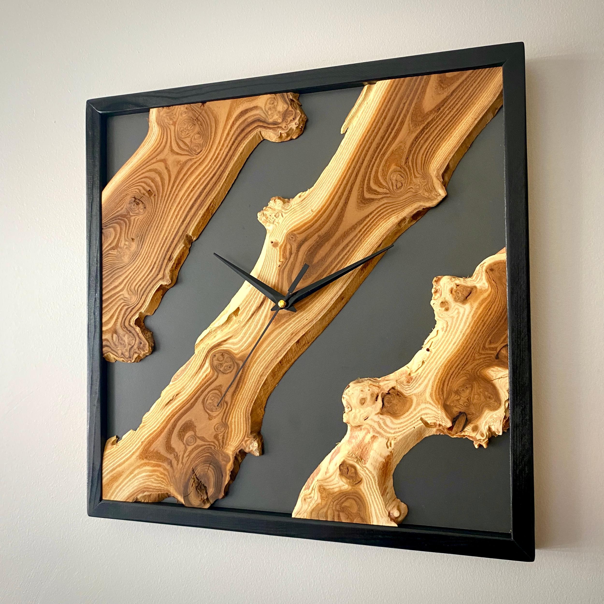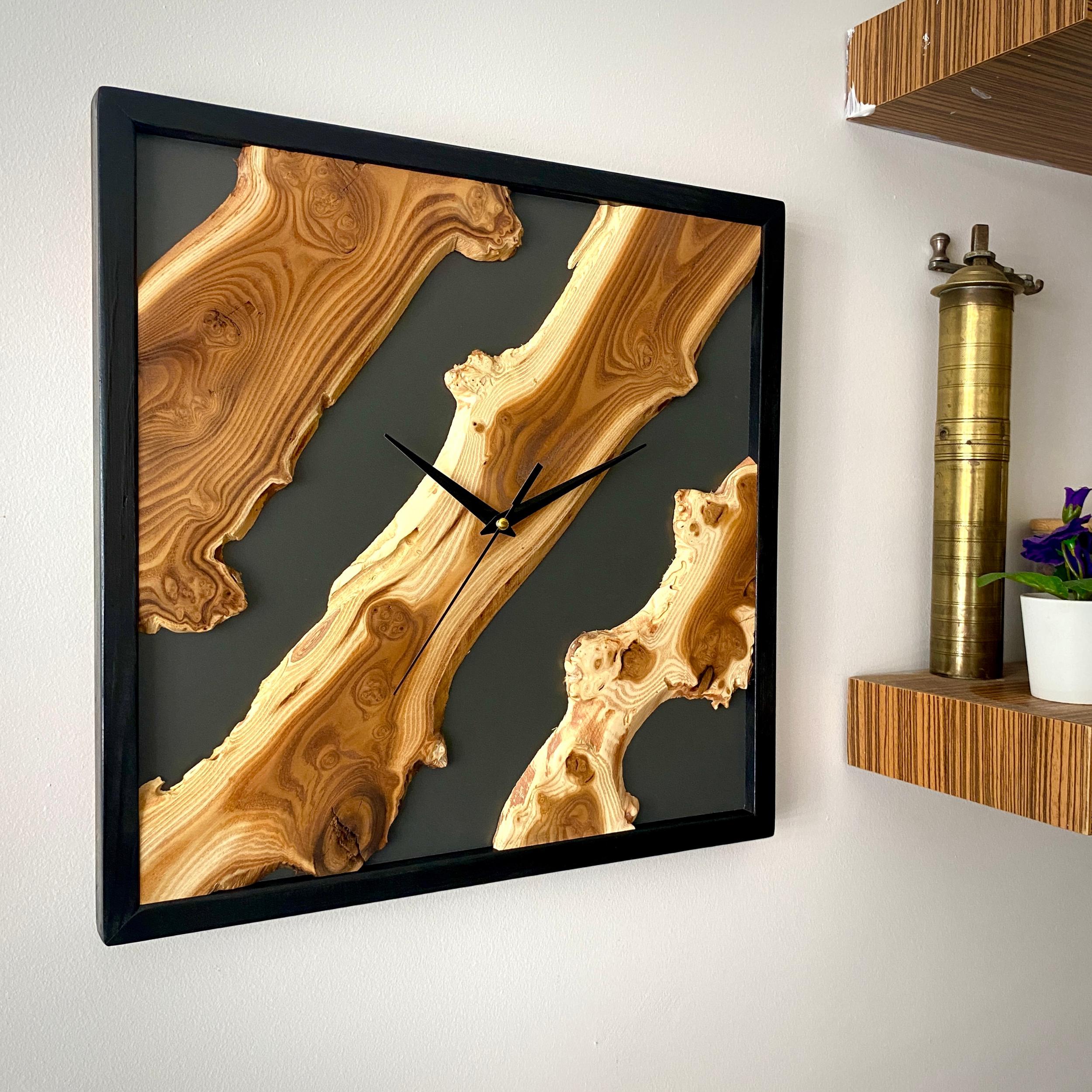 Live Edge Olive Wood Clock: Rustic Black Frame Wall Art