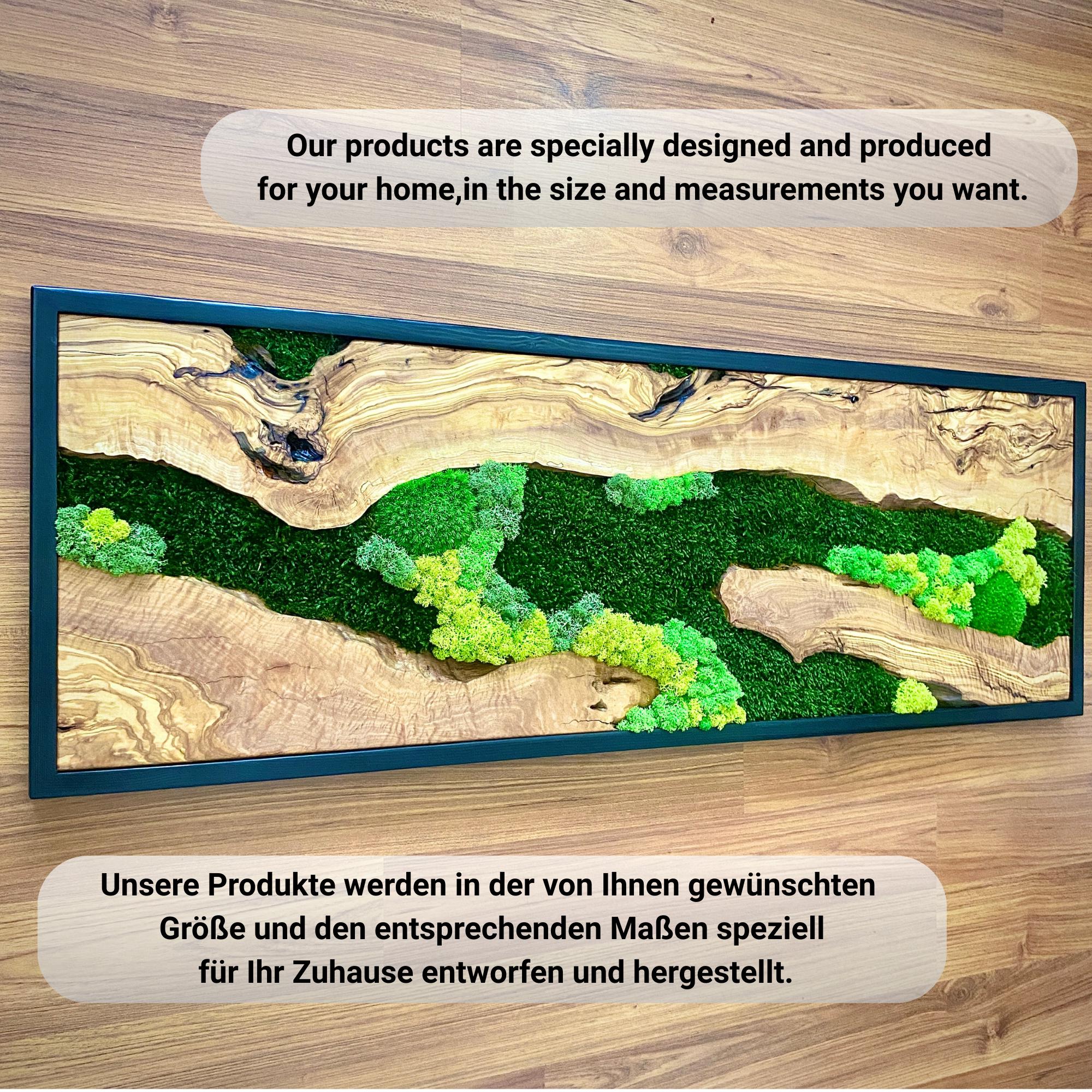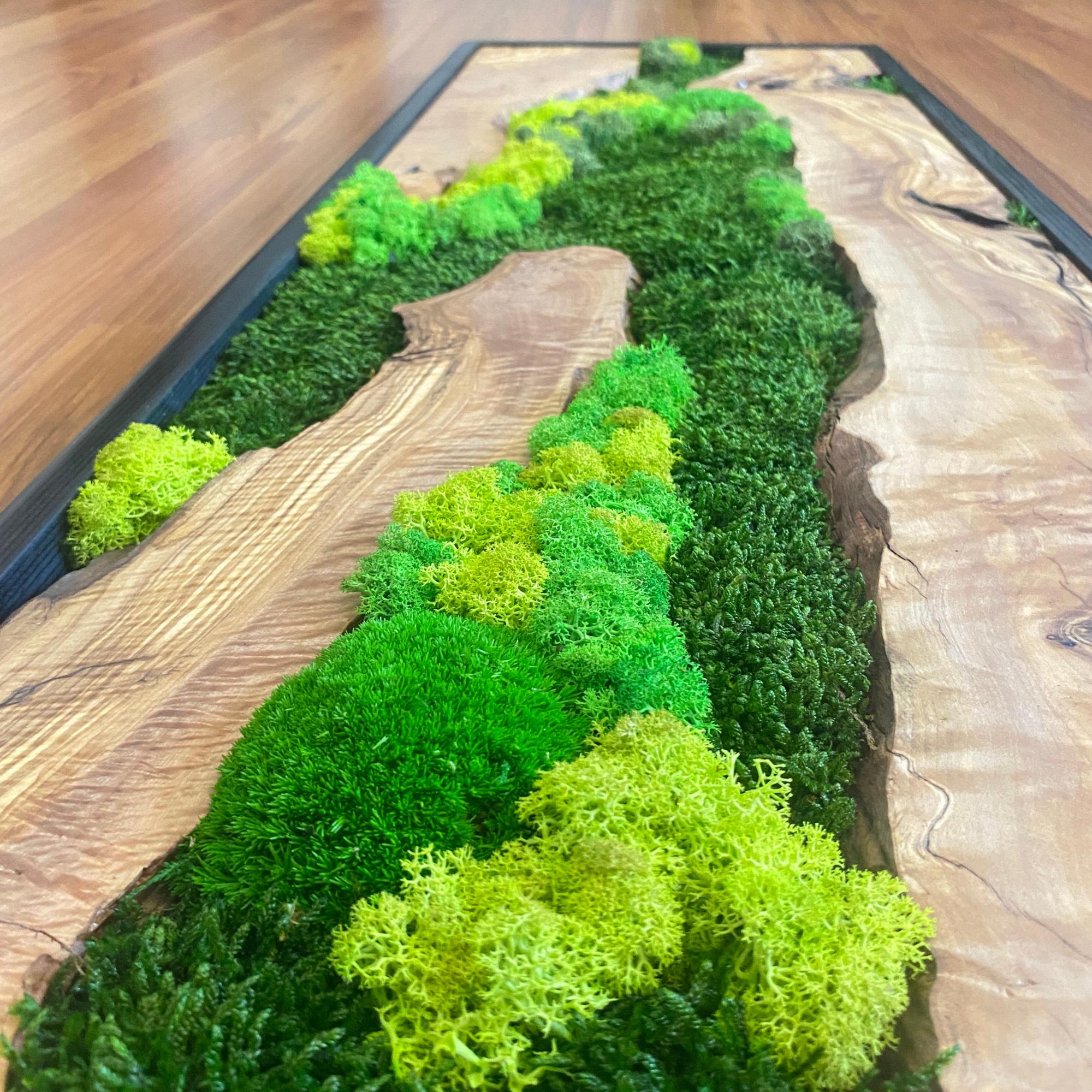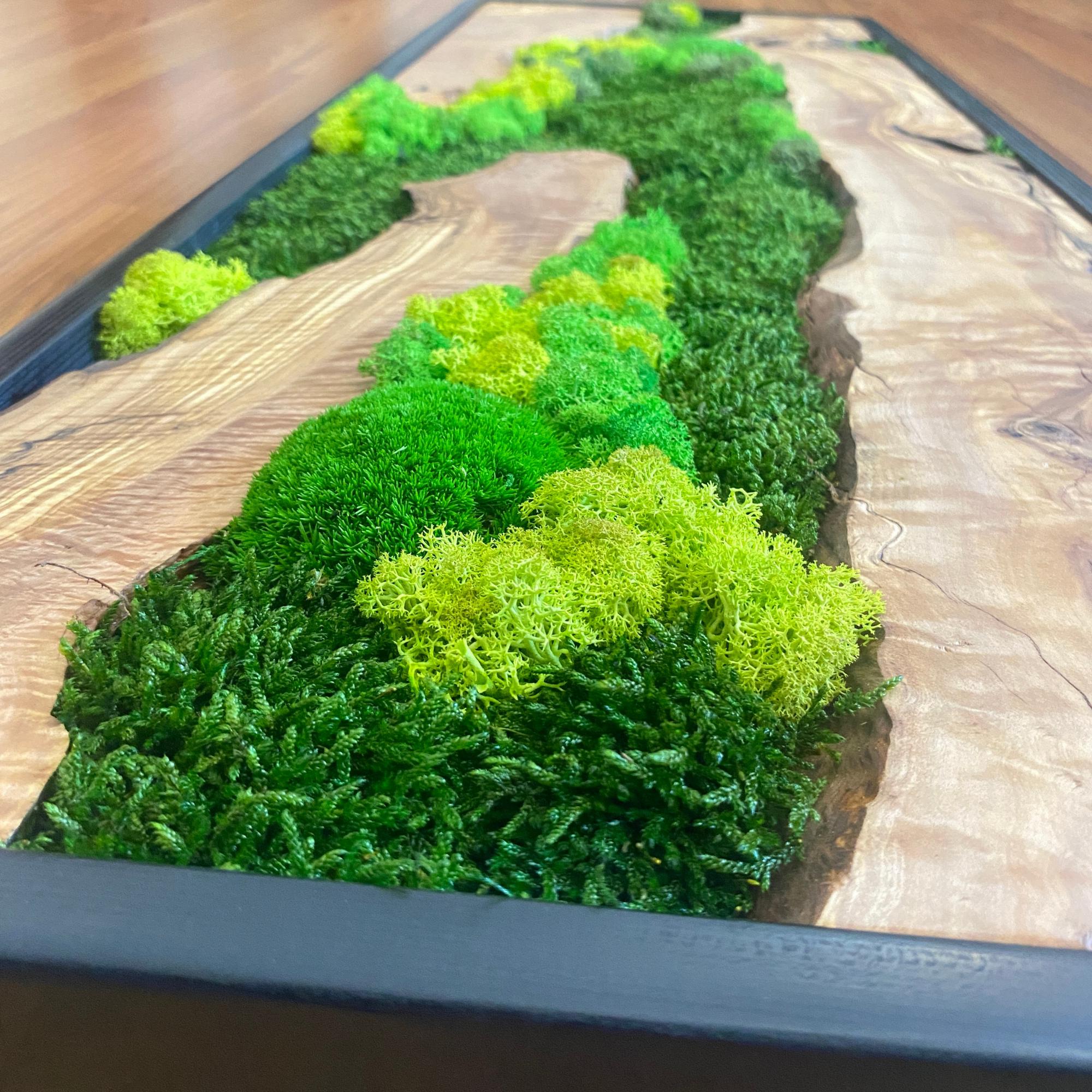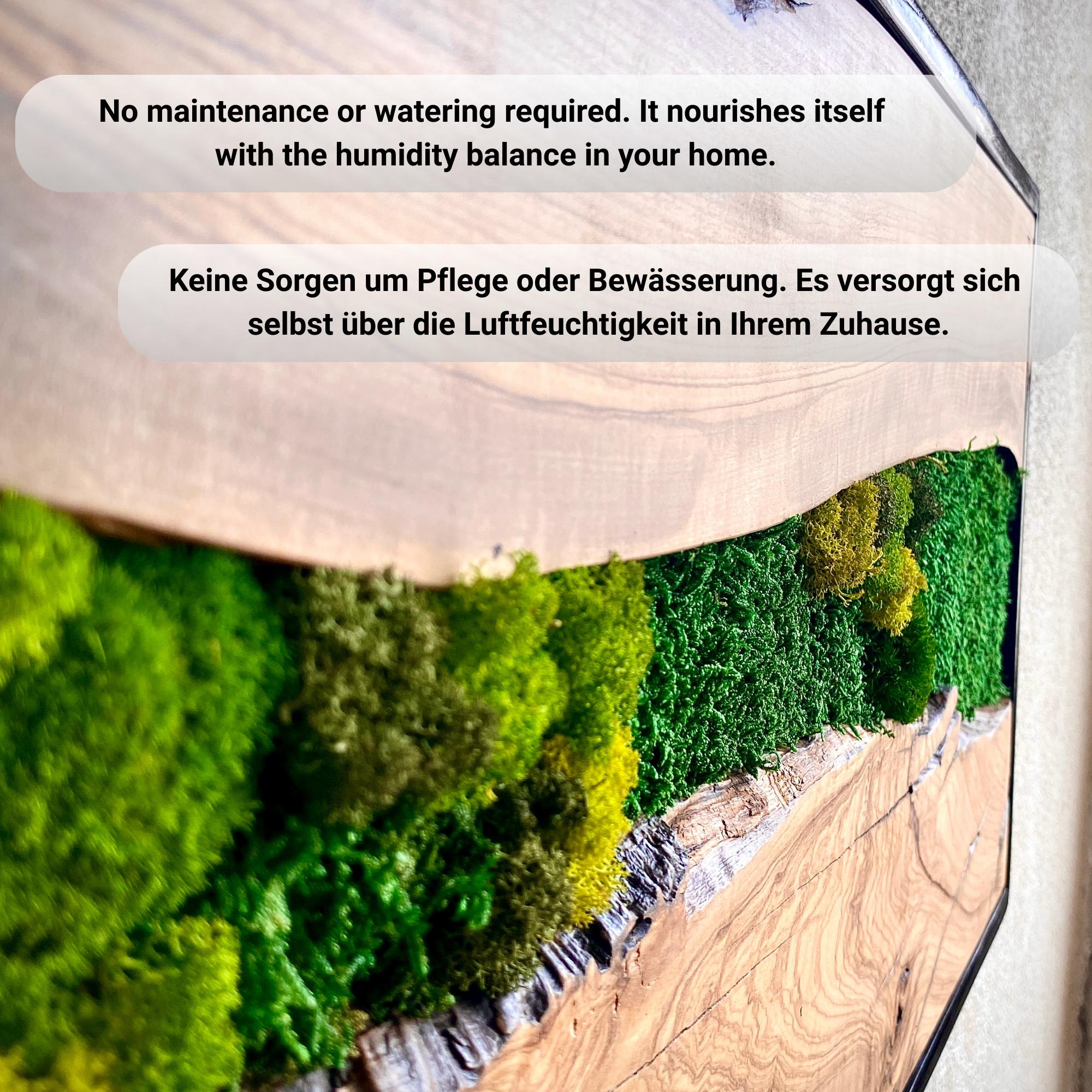 Preserved moss wall art needs no upkeep like watering, sunlight, or fertilizing. It stays the same size, just keep it away from sunlight, water and too much air.